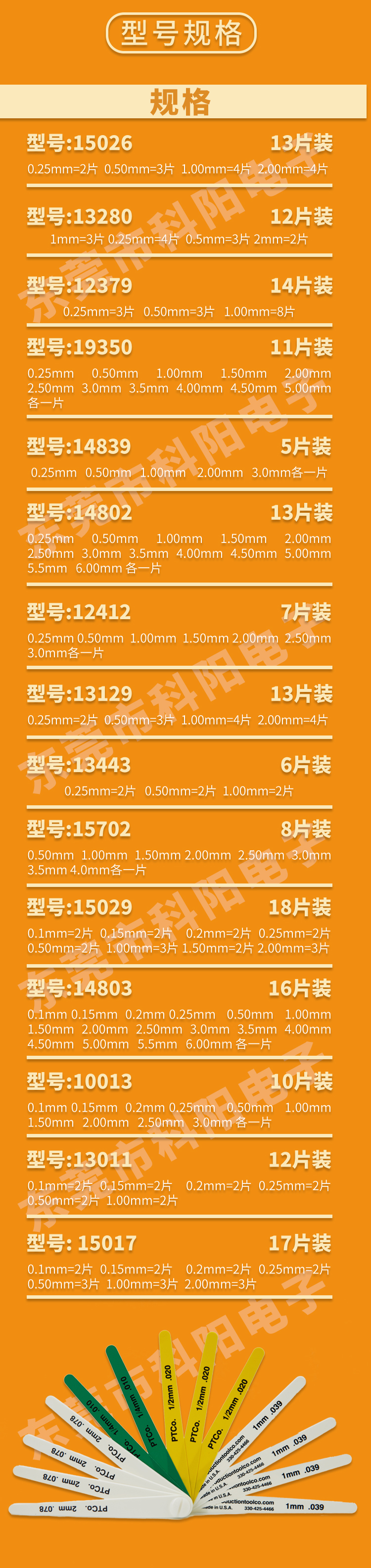 厚度:0.25mm=3片 0.50mm=3片 1.00mm=8片