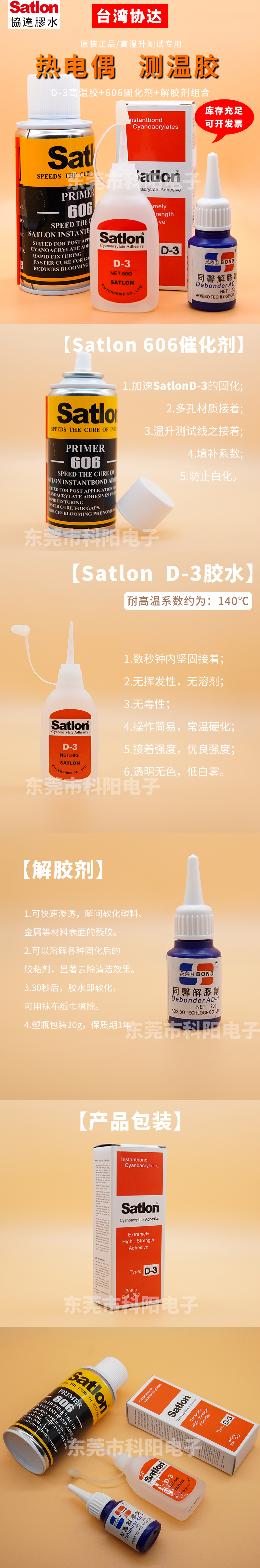 Satlon D-3/Satlon606耐高溫安規(guī)測(cè)試膠水,又名溫升膠、熱電藕膠、測(cè)溫膠、冷凝劑、溫度打點(diǎn)膠。單一成份接著劑,幾乎所有能夠緊密結(jié)合的各種平面都可接合,不需要預(yù)先混合,加熱,不含溶劑,輕微味道無(wú)燃性,無(wú)毒性。配合專用satlon606催化劑可以5-10秒固化,使用極為方便。